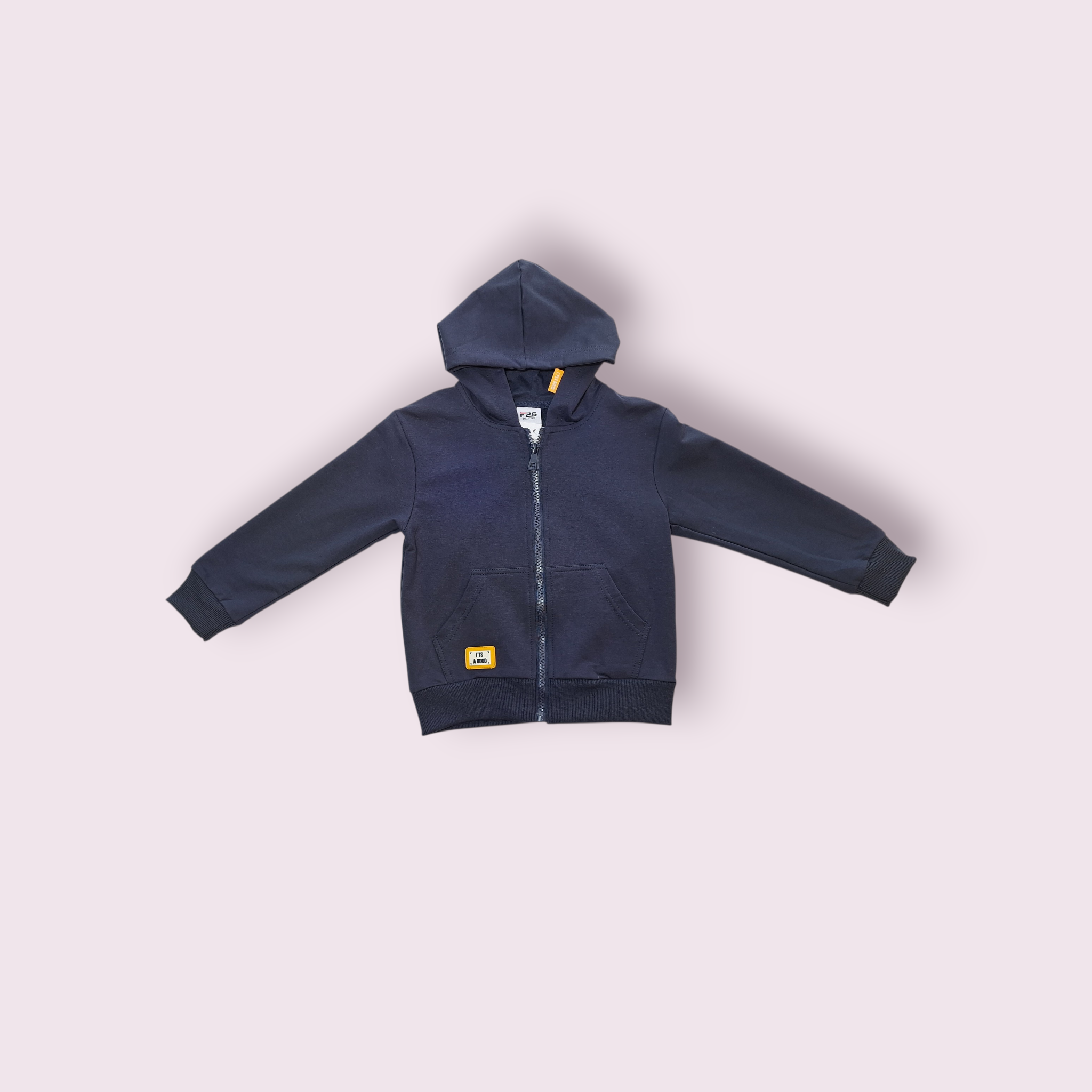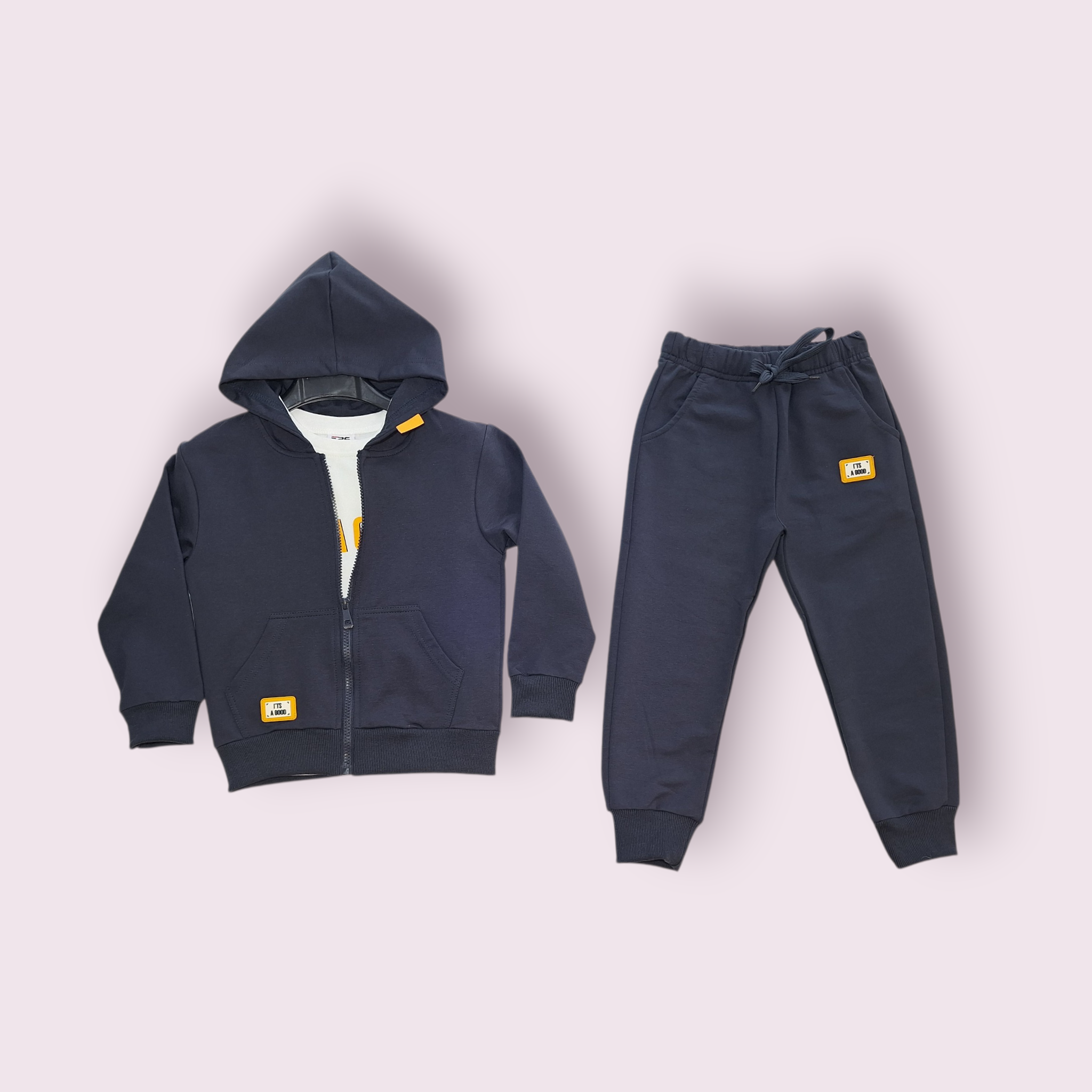 Šis trijų dalių sportinis komplektas berniukui tai puikus pasirinkimas norint būti stilingam bei jaustis patogiai. Komplektą sudaro: palaidinė ilgomis rankovėmis, sportinės kelnės bei sportinis bliuzonas su gobtuvu bei kišenėmis. Komplektas neperkrautas detalėmis, o emblema „I’TS A GOOD” suteikia šiuolaikinį ir stilingą įvaizdį. Tamsiai mėlyna spalva pasižymi praktiškumu. Tiek bliuzonas, tiek sportinės kelnės turi kišenėles. Kelnių liemuo yra su guma, tačiau taip pat turi raištelį. Kelnių galai, bliuzono rankovių galai bei bliuzono apačia labai elastinga ir puikiai priglunda prie kūno.